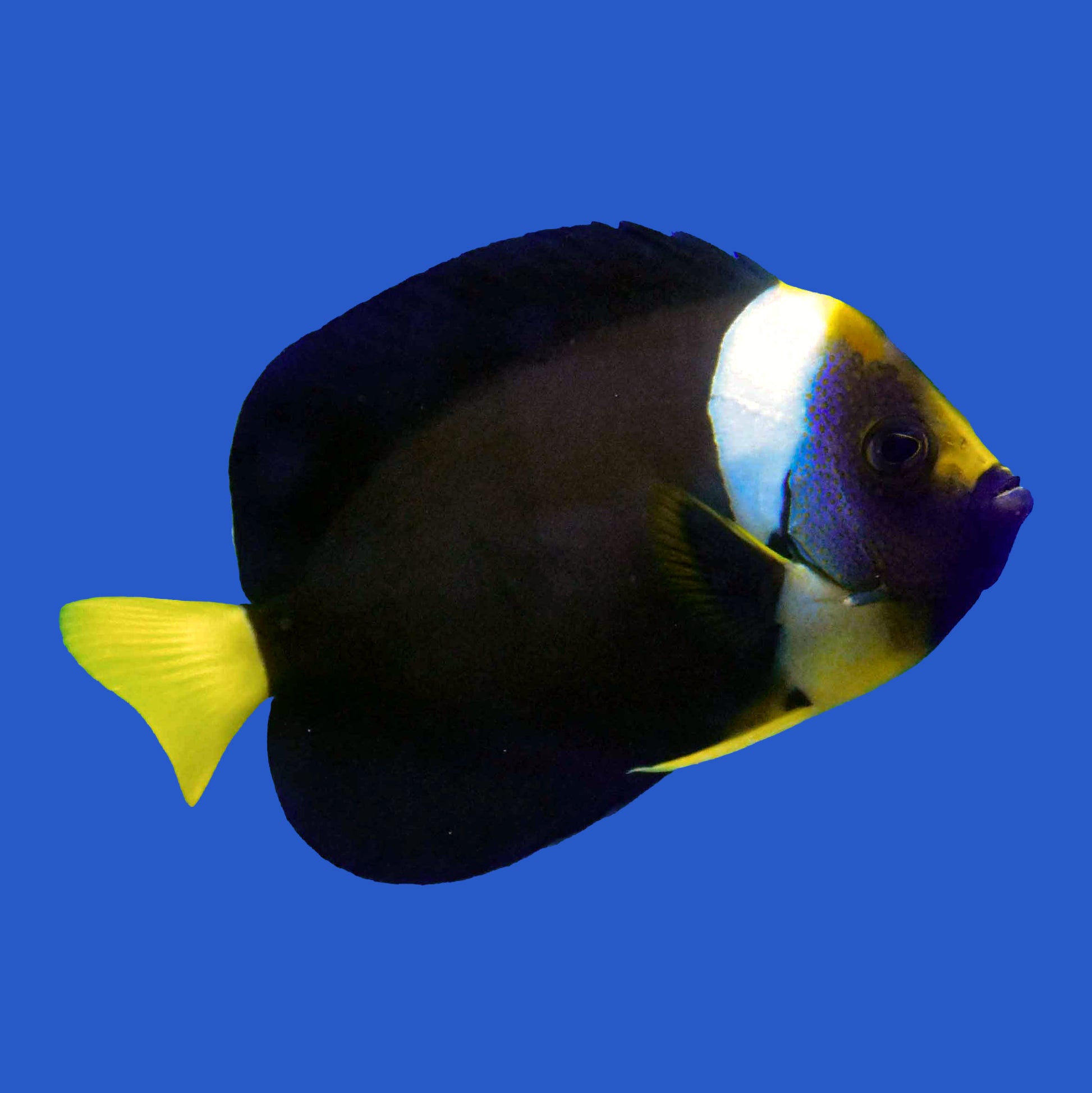 The False Personifer Angelfish, also known as Meredith's Angelfish, is a captivating marine fish admired for its unique and striking appearance. The body is predominantly dark brown to black, with a contrasting pale to white face, giving it a dramatic, masked appearance. The most distinctive feature is its bright yellow tail, which stands out sharply against the darker body. This eye-catching coloration and pattern make the False Personifer Angelfish a standout addition to marine aquariums. Although generally hardy, it is considered reef safe with caution, as it may occasionally nip at soft corals and small invertebrates if not adequately fed. To reduce such behavior, provide a varied diet rich in algae and offer plenty of live rock for grazing and hiding. The False Personifer Angelfish thrives in tanks with ample hiding spots and a stable environment, making it a beautiful and manageable choice for experienced aquarists.
