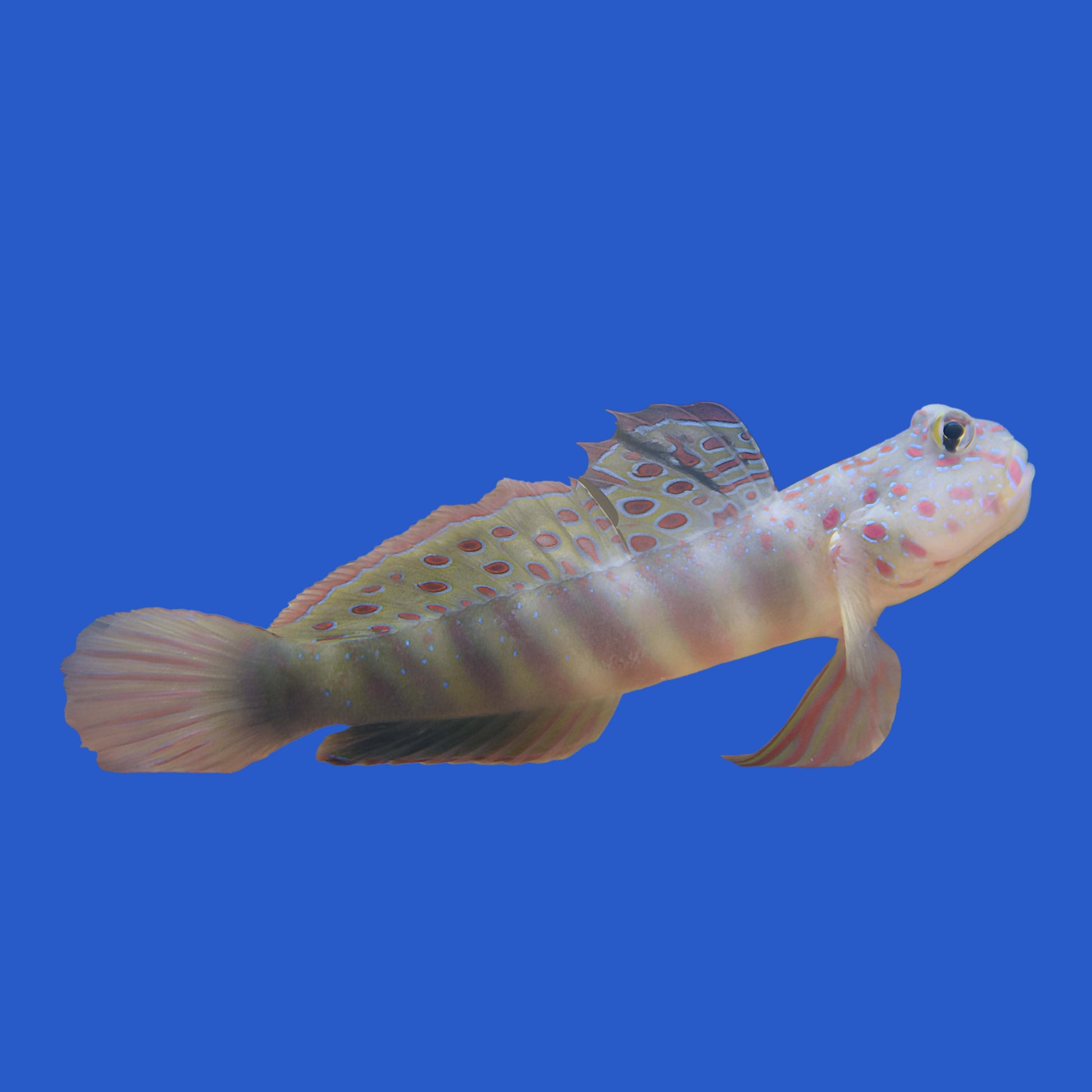 The Spotted Watchman Goby features a yellow-tan body covered in pink and blue speckles. Peaceful by nature but territorial toward its own kind, it thrives in aquariums of at least 30 gallons with sandy bottoms and coral rubble for burrowing. Because it can jump, a secure lid is essential. This species enjoys a meaty diet of mysis and brine shrimp, table shrimp, and other frozen carnivore foods, ideally fed twice daily.
