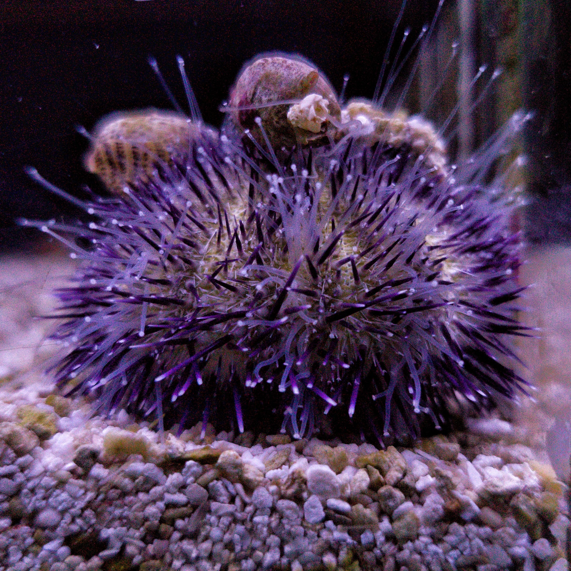 The Purple Pincushion Urchin is easily distinguished with its white body and hundreds of short purple spines. An excellent addition to an aquarium’s clean up crew, the Purple Pincushion Urchin scavenges for food and algae on rocks on in the substrate. Though generally solitary animals, they can be kept with other sea urchins as long as enough food is provided. They should be fed dried seaweed if algae levels in the water are low.