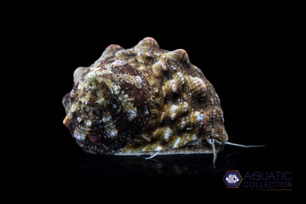 The Jumbo Turbo Snail has a thick turban or top-like shell that is iridescent on the inside. They will do well in aquariums with holes and crevasses to hide and lots of space to graze on algae. Because they can keep the algae in aquariums under control and can also graze on glass, they are well-liked by many aquarists. Their shells are built from calcium so an adequate amount of calcium is needed in the aquarium. They are sensitive to copper-based medication and prefer lower nitrate levels.