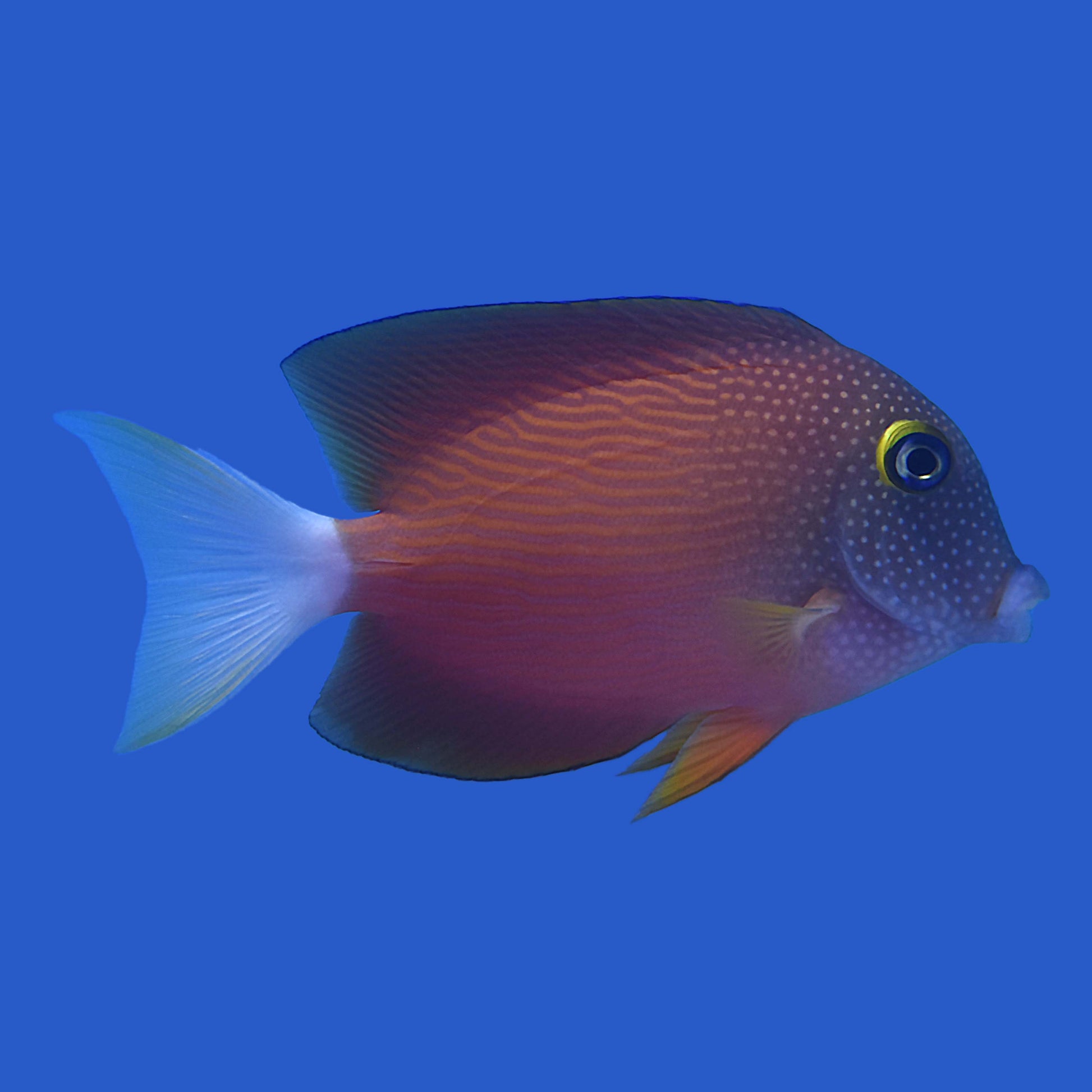 The Kole Tang, also known as the Yellow Eye Kole Tang or Bristletooth Tang, is a hardy and attractive fish appreciated for its deep brown body adorned with fine blue horizontal stripes and a distinctive yellow ring around its eyes. Native to the reefs of the Pacific Ocean, this tang is an excellent algae grazer, playing a crucial role in maintaining a clean and balanced reef environment. The Kole Tang is generally peaceful but may show territorial behavior towards other tangs. It thrives in a well-established aquarium with ample swimming space and plenty of live rock to graze on. Its beneficial algae-eating habits, coupled with its striking appearance, make the Kole Tang a valued addition to any reef tank.