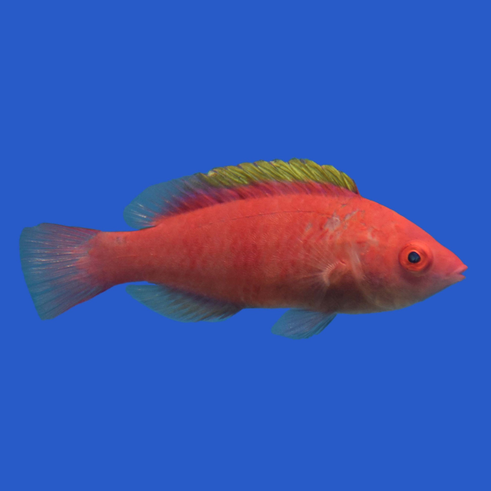The Yellow-Fin Fairy Wrasse is a lively, colorful fish featuring red and white tones with a bright yellow dorsal fin. Females are softer pink with white undersides, while males display deeper hues when courting. Constantly active, this peaceful species thrives in 50 gallon or larger aquariums with shaded areas and a secure lid to prevent jumping. Ideal for reef setups, it won’t harm corals or invertebrates. Its diet should include mysis and brine shrimp, meaty foods, and quality marine flakes or pellets.